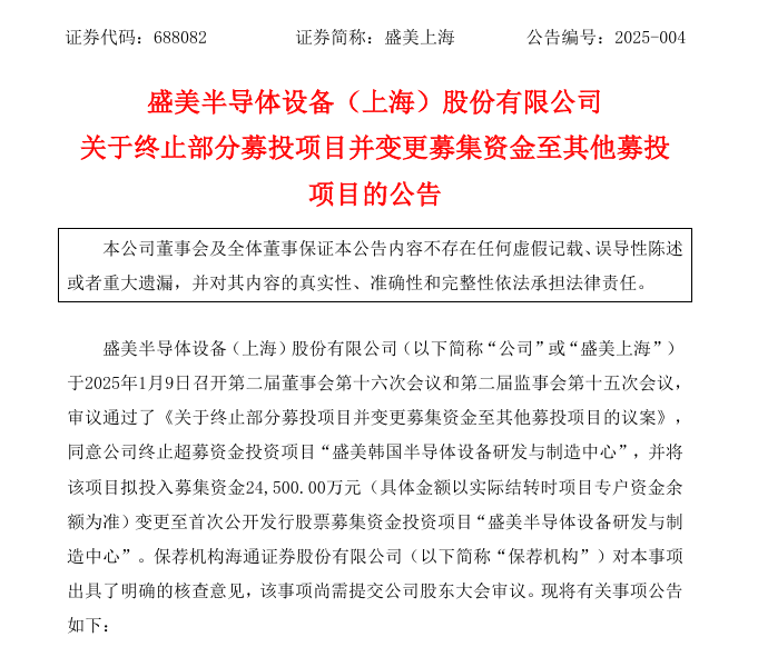 中国粉体网讯近日,盛美半导体设备(上海)股份有限公司发布公告,宣布其董事会已批准终止原计划中的“盛美韩国半导体设备研发与制造中心”项目,并将原计划投入该项目?4,500万元募集资金,变更至首次公开发行股票募集资金投资项目“盛美半导体设备研发与制造中心”、/p>