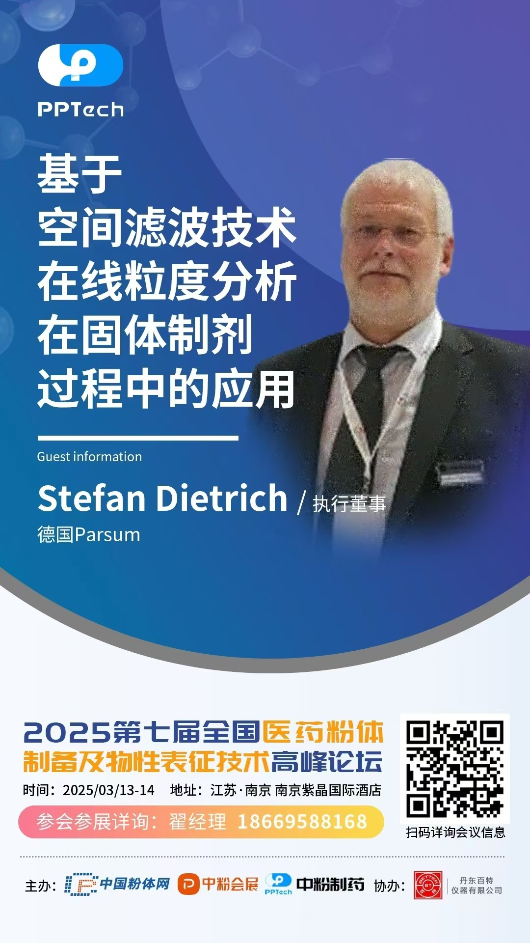 以“从粉体技术,论制药工艺”为主题?025??3-14日中国粉体网将在江苏南京紫晶国际酒店举办‛strong>2025第七届全国医药粉体制备及物性表征技术高峰论坚/strong>”。届时来自德国Parsum公司的执行董事Stefan Dietrich博士为大家带来〉span style="color: rgb(255, 0, 0);">基于空间滤波技术在线粒度分析在固体制剂过程中的应用》的主题报告。报告主讲人将用实际数据,展示在线粒度分析在各种造粒设备上应用的重要性和先进性。尤其是在一步制粒或全自动连续造粒上,在线粒度分析的重要性?nbsp;
