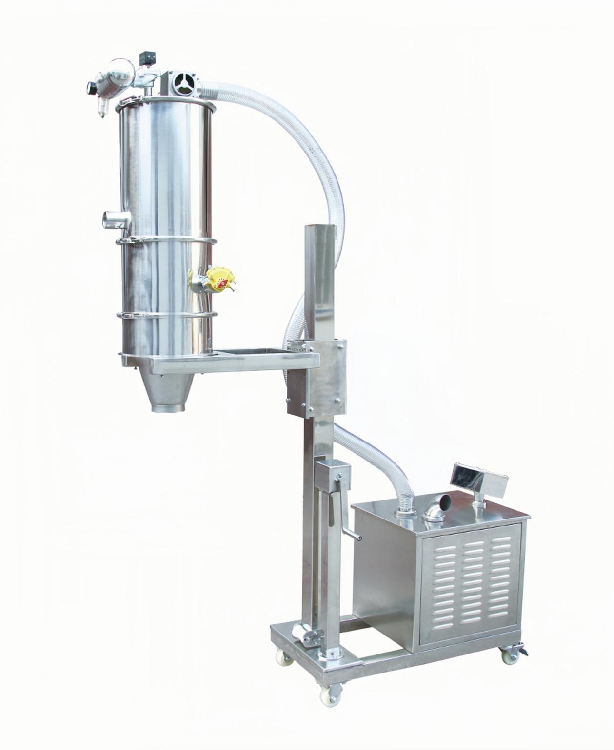 真空上料机主要利用真空泵产生的负压,在进料口与物料储存容器之间形成压力差,使医药粉体在大气压力的作用下被吸入进料口,通过输送管道进入储料仓或加工设备。当达到设定的上料量或储料仓内达到一定压力时,真空泵停止工作,进料口的阀门关闭,完成一次上料过程、/p>