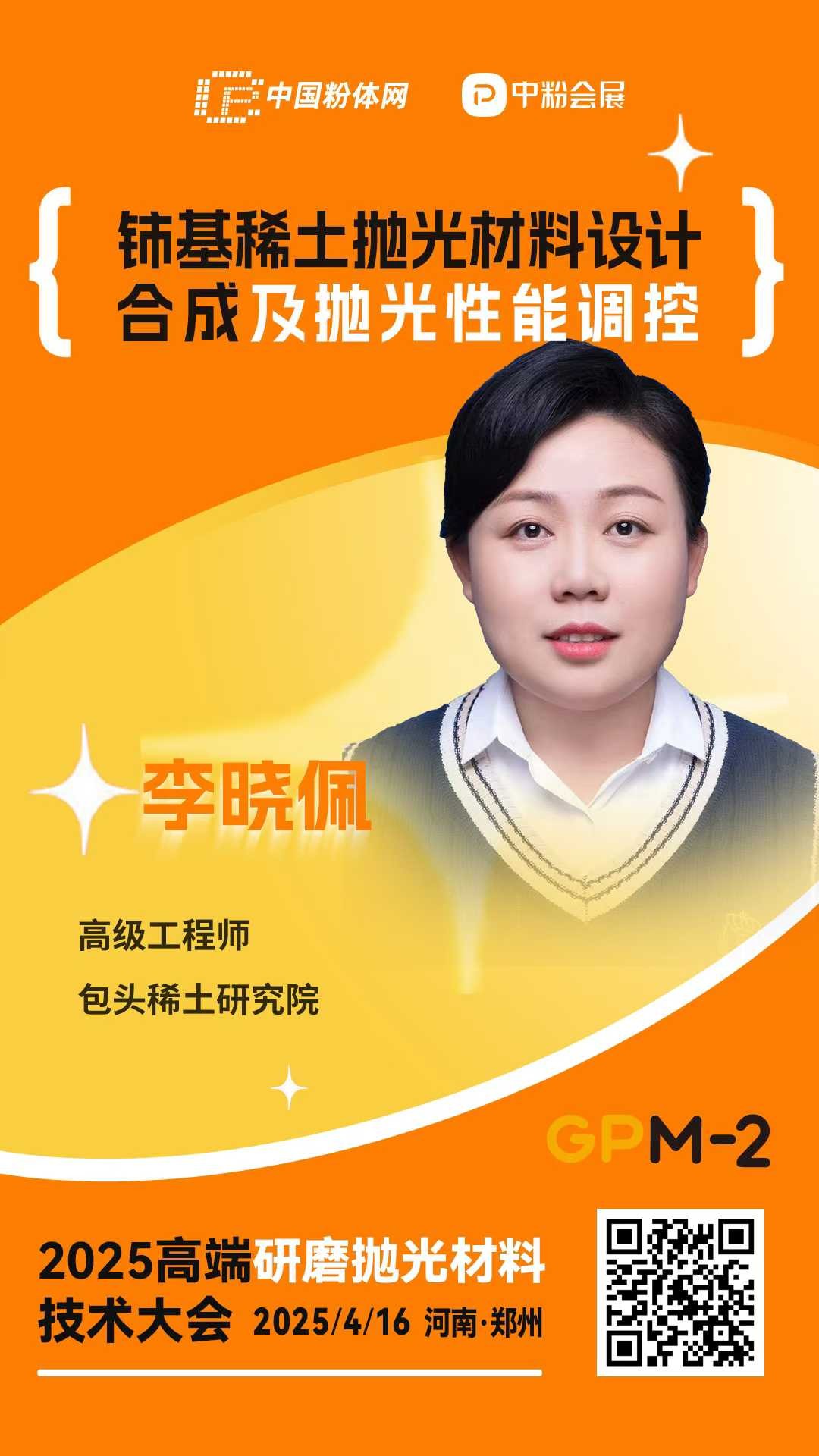 研磨抛光技术在集成电路芯片的制作中具有重要作用,针对高端研磨抛光相关的技术、材料、设备、市场等方面的问题,中国粉体网将亍strong>2025??6?/strong>?strong>河南郑州举办2025第二届高端研磨抛光材料技术大会、/strong>届时+strong>包头稀土研究院高级工程师李晓佩将作题为《铈基稀土抛光材料设计合成及抛光性能调控《/strong>的报告、/p>