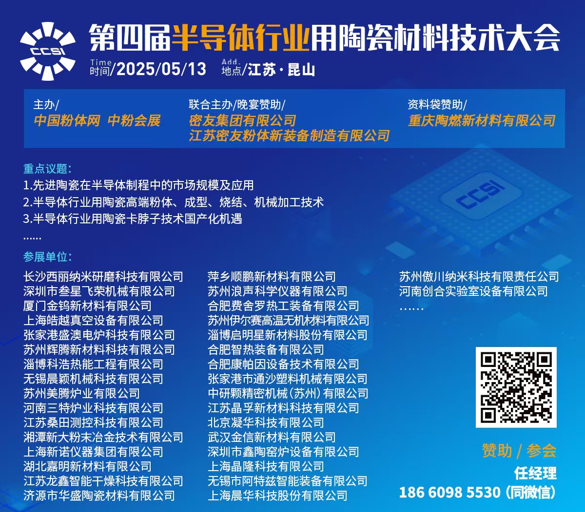 第四届半导体行业用陶瓷材料技术大伙/span>将于2025??3?/span>?/span>江苏·昆山举办、strong>张家港市通沙塑料机械有限公司作为参展单位邀请您共同出席、/span>