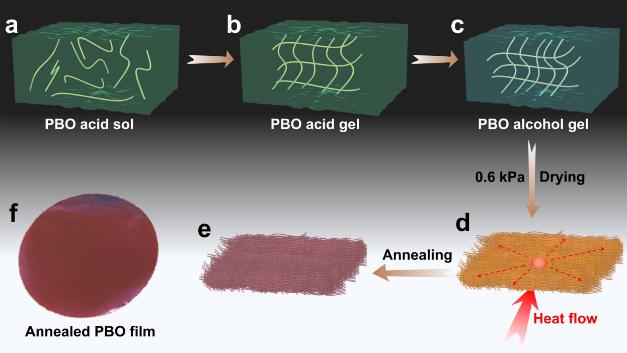 在提升聚合物自身导热性能方面,赵宁课题组通过剥离聚对苯撑苯并二噁唑(PBO)纤维获得纳米纤维分散液,结合溶?凝胶-薄膜转变与热退火工艺,制备出高度取向的PBO薄膜,其面内热导率达36.7 W/m·K,比常规聚合物(< 0.5 W/m·K(strong>提高两个数量?/strong>,同时保持优异的电绝缘性与阻燃性、/span>这种本征高导热聚合物的开发,为高温、复杂环境下的热管理提供了新选择、/p>