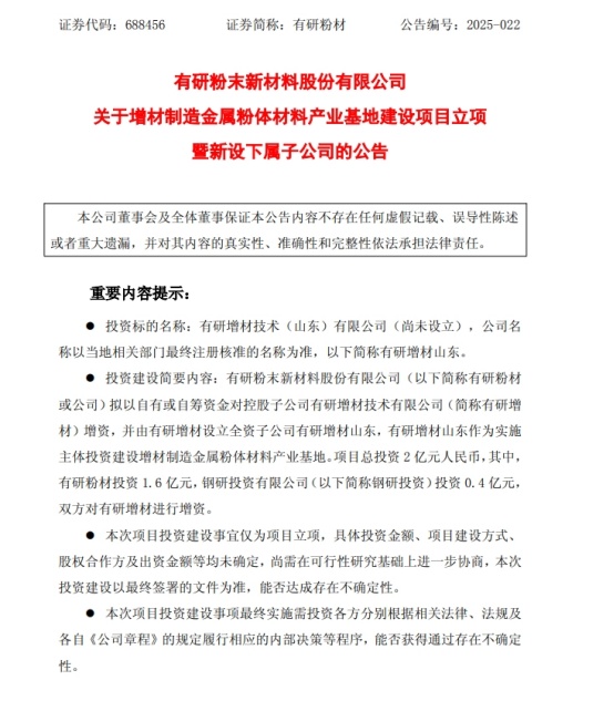 有研粉材:拟抔/span>2亿元建金?D打印粉体材料产业基地
