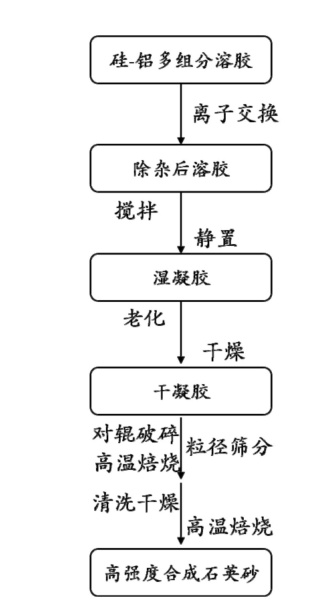 江苏鑫华半导体科技股份有限公司公布了一种高强度人工合成石英的制备方法,包括以下步骤,步?:得到硅?铝多组分溶胶;步?:将?#8209;铝多组分溶胶通过离子交换柱,得到处理液;步骤3:将处理液转入反应釜中,进行搅拌;步?:搅拌结束后,静置,得到湿凝胶;步骤5:将湿凝胶用高纯水浸泡并清洗;步?:将清洗后的湿凝胶进行干燥,得到干凝胶;步骤7:干凝胶使用辊式破碎机粉碎;步骤8:将干凝胶放入回转炉中进行烧结,得到石英砂;步骤9:将石英砂进行超声清洗,随后干燥;步?0:将干燥后的石英砂进行焙烧,得到人工合成石英;选择合理的铝源以形成均匀凝胶结构,从而制备高纯度、高均匀性、高强度的合成石英砂、/p>