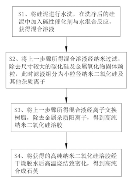 江苏德鑫新材料科技有限公司公布了一种利用硅泥制备高纯合成石英的方法,包括以下步骤:将硅泥进行水洗,在洗净后的硅泥中加入碱性催化剂与水混合反应,获得混合溶液;将上一步骤所得混合溶液经纳米过滤,除去尺寸较大的碳化硅及金属氧化物固体颗粒,此时滤液组分为小粒径纳米二氧化硅及其他杂质离子。本发明在对硅泥处理时无需使用酸洗的方式对硅泥进行预处理,使得制备过程中无废酸废水排放,工艺简单,对环境友好,且硅泥中杂质采用多级过滤膜组物理依次去除方式分离,分离成本低,且不影响金属氧化物、碳化硅的再回收利用,资源利用更加充分合理,目标高纯合成石英中无碳化硅夹杂,纯度更高、/p>