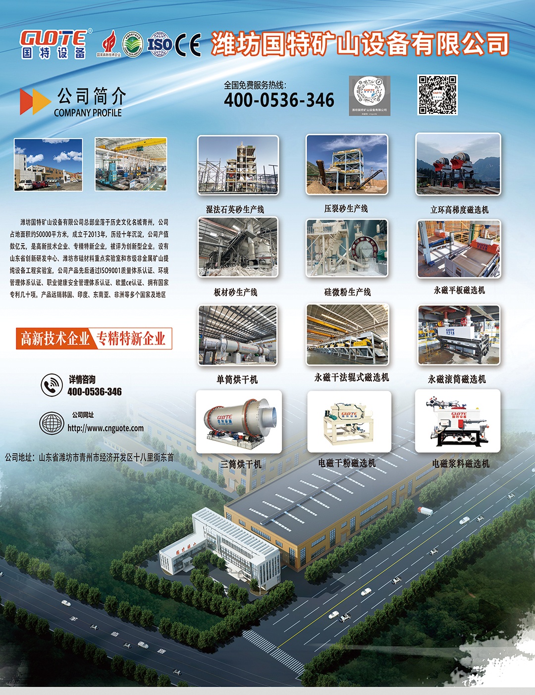 潍坊国特矿山设备有限公司总部坐落于历史文化名城青州,公司占地面积?0000平方米,成立?013年,历经十年沉淀,公司产值数亿元。是高新技术企业、专精特新企业,创新型企业,设有技术研发中心,潍坊市硅材料重点实验室和市级非金属矿山提纯设备工程实验室,公司产品先后通过ISO9001质量体系认证、环境管理体系认证、职业健康安全管理体系认证、欧盟ce认证、拥有国家专利几十项 国特设备长期致力于石英砂、石英板材砂、硅微粉专用设备,立环高梯度磁选机、平板磁选机、滚筒磁选机及其他石英砂配套设备的生产研发和提供上述生产线的实验、设计、咨询及整线供货;经十年如一日的辛勤探索公司建立了集科研开发、工程设计、生产安装、调试服务为一体的服务体系 通过国特人的拼搏与奋斗,成就了以“可靠、高效、简单”经营理念,以优质的服务、高度的敬业精神铸就了享誉国内外?quot;国特"品牌,走出了一条以绿色矿山为根本,高效环保的可持续性发展之路,为矿山设备行业的发展与繁荣做出了突出贡献、/p>