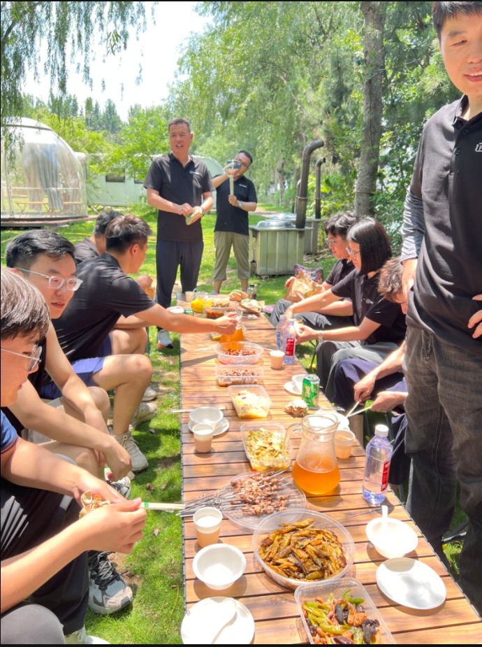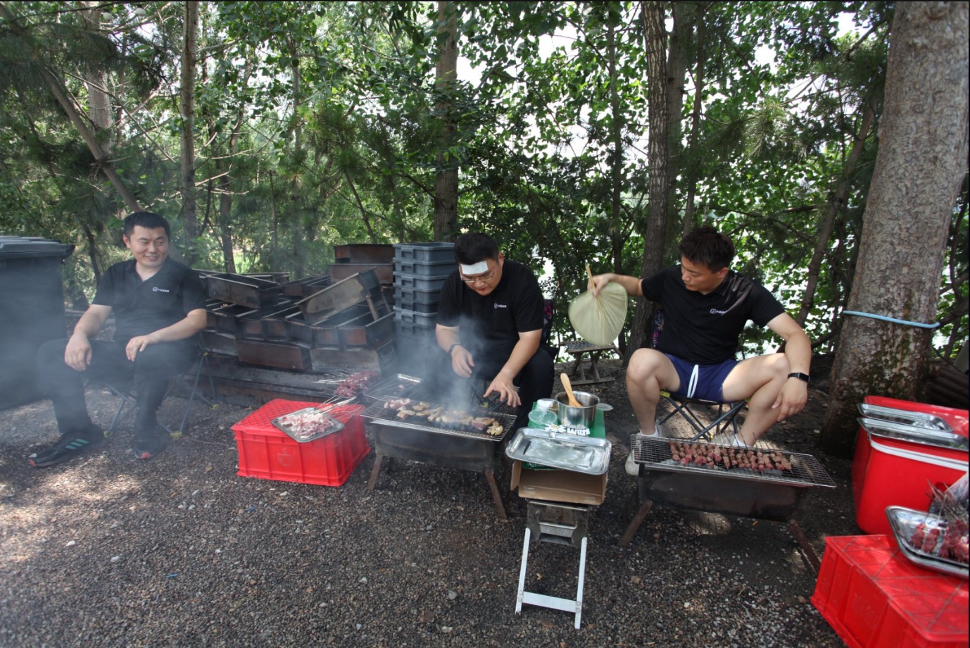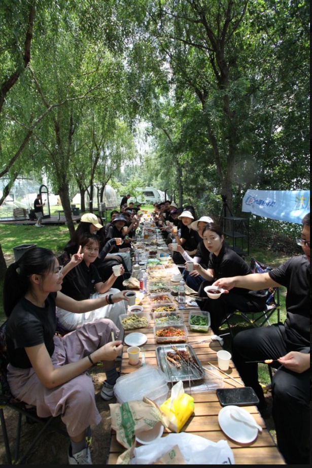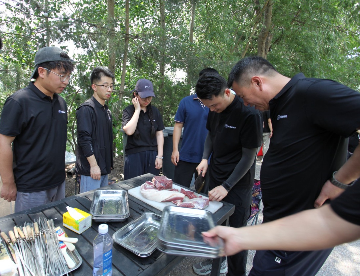 游戏的欢呼余韵未散,众人便迅速投入烧烤“美食战场”。大家密切配合,有的熟练地将鲜嫩肉块切成小块;有的则化身“串串大师”将肉块错落有致地串在竹签上;经验丰富的“烧烤达人”则守在烤炉旁,精准把控火候,适时翻面。炭火噼啪作响,肉串滋滋冒油,欢声笑语中,阵阵香气弥漫开来,将团建的欢乐氛围推向新的高潮、/p>