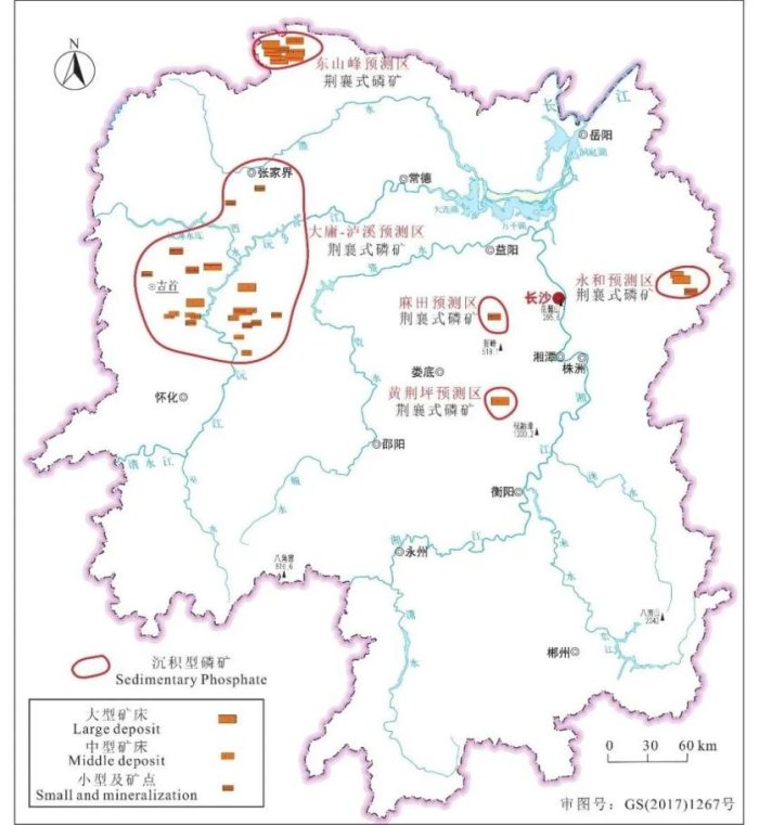 湖南省是一个磷矿资源丰富的地区,磷矿类型以海相沉积磷块岩矿床为主,总共?6处矿产地被发现,其中38个探明了小型规模以上的储量。这些磷矿主要分布在湘西北和湘东北地区,?0%以上的磷矿资源集中在常德、怀化、湘西、长沙等市州。根据全省磷矿床的分布情况以及成矿地质条件的结果分析,重要远景区分别分布在东山峰、大庸—泸溪和永和地区、/span>
