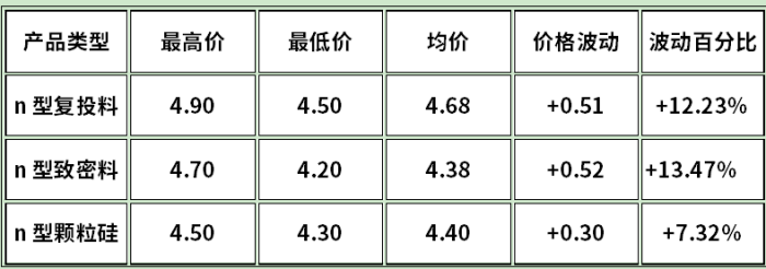 光伏产业的核心主材多晶硅的现货价?月内连续3周环比提升,截至2025??6日当周,多晶硅n型复投料成交均价?.17万元/吨,n型颗粒硅成交均价?.10万元/吨,成交均价回升?万元/吨以上,且成交活跃度有所提升,多晶硅n型复投料成交均价和n型颗粒硅成交均价分别?月下旬提升约21%?2%、br/>