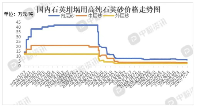 国产高纯石英砂的价格,以光伏坩埚中层砂为例,2023年巅峰时期均价在21万元/吨,2024?月高纯石英砂价格开始一路下滑,至年底时均价已降?.5万元/吨,暴跌了超?0%。从2025?月中下旬开始,该均价继续下行至2.75万元/吨,且貌似有继续下行的迹象、br/>