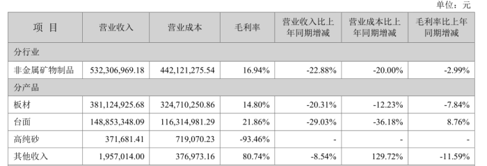 中旗新材2024年年度报告的数据也印证了高纯砂业务的困境。报告显示,公司全年实现营业收入5.32亿元,同比下?2.88%;归属于上市公司股东的净利润?051.15万元。其中,高纯砂业务表现尤为惨淡,营业收入仅为371,681.41元,而营业成本却高达719,070.23元,毛利率低?93.46%,陷入严重亏损状态、/p>