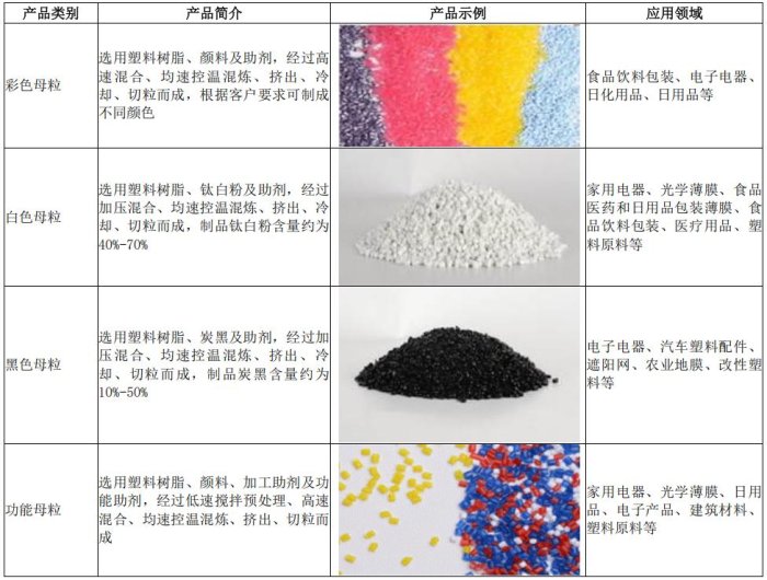 公司的主要产品为色母粒,有彩色母粒、白色母粒、黑色母粒和功能母粒等四大产品类?/span>,广泛应用于PE、PP、AS、PET、EVA、ABS等塑料制品领域,并最终应用于电子电器、日用品、食品饮料、日化、建材、农业、汽车、医疗等行业、/span>