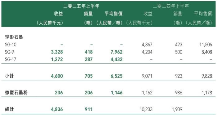 2025年上半年主要销售型号SG-9及SG-17。球形石墨的型号(即SG-9及SG-17,直径分别为9微米?7微米的球形石墨)乃根据加工球形石墨的大小而定,球形石墨的其他规格可能包括相关球形石墨指定密度、纯度或形状。作为球形石墨加工过程的副产品,我们亦生产及销售微型石墨粉、/span>