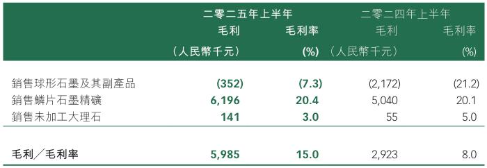 销售球形石墨及其副产品的毛损及毛损率于2025年上半年约为人民?.4百万元及7.3%,耋/span>2024年上半年的毛损及毛损率则约为人民?.2百万元及21.2%、/span>