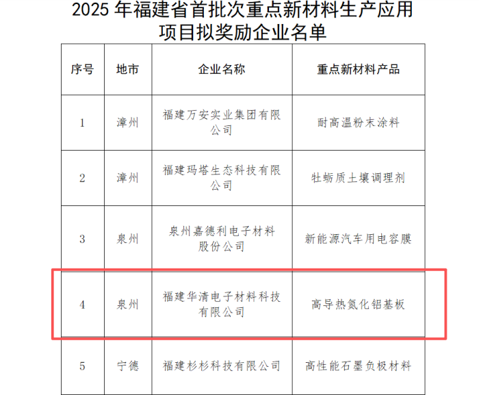 中国粉体网讯近日,福建省工信厅公?025年福建省首批次重点新材料生产应用项目拟奖励企业名单,福建华清电子材料科技有限公司入选、/p>
