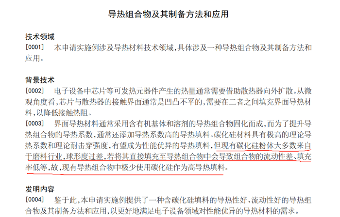 而华为的解释却是9span style="text-decoration: underline;">现有碳化硅粉体大多数来自于磨料行业,球形度过差,若将其直接填充至导热组合物中会导致组合物的流动性差、填充率低等,故现有导热组合物中极少使用碳化硅作为高导热填料、/span>