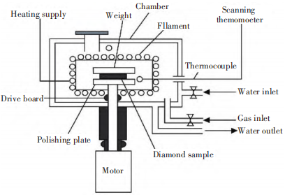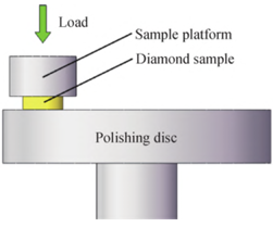 机械抛光是利用金刚石与高速旋转的抛光盘(铸铁盘、砂轮盘)相互摩擦产生脆性断裂去除表面材料的抛光工艺,同时,由于高速旋转的抛光盘与金刚石摩擦会产生高温,而高温提供了“硬”的金刚石相向“软”的石墨相转变的驱动力,通过利用微切削与石墨化相结合的原理实现金刚石的抛光、/p>