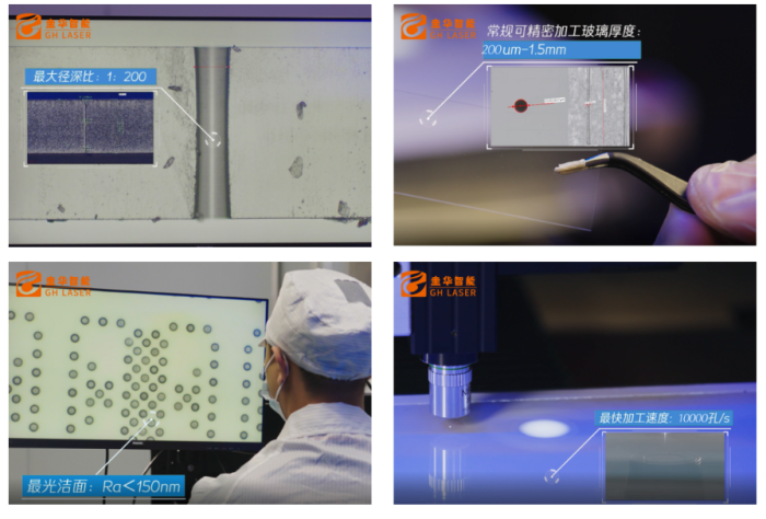 可实?:200的超大径深比,孔壁光洁度精准控制?50nm以内,加工效率高?0000?秒,在常规工况下,能对厚度为200μm?.5mm的玻璃开展高精度精密加工、/p>