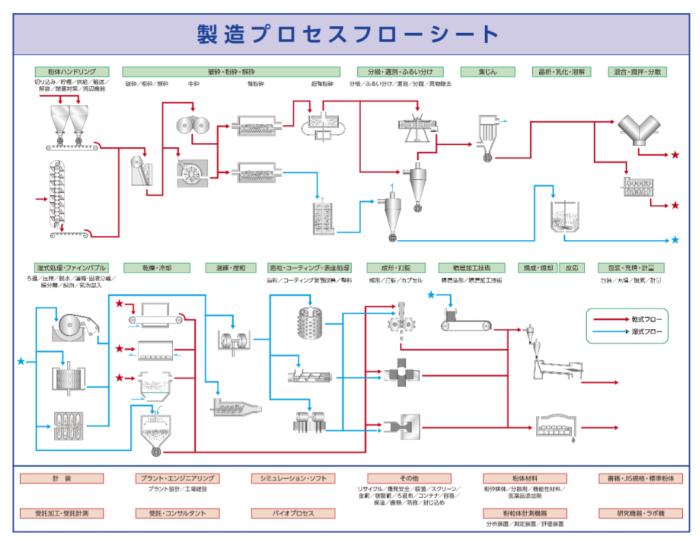 为了高效且可靠地操作这些流程,需要运用“仪表技术”来检测设备的相关参数并控制各个工序;同时,还需要借助“工程技术”将多种技术组合起来,构建完整的工厂系统。此外,由于粉粒体具有粒径、密度、形状、表面积以及在流体中的浓度等多种需要测量的特性,因此相关“粉粒体测量设备”的研发工作也正在积极推进中、/p>