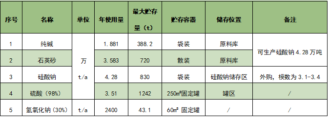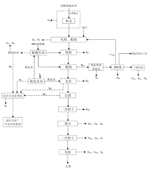 该项目产品的主要生产工艺分为两步:第一步是生产硅酸钠,硅酸钠的生产方法包括干法和湿法工艺,干法工艺一般以石英砂和纯碱为原料,通过配比进入马蹄焰炉,在高温条件下形成熔融状态硅酸钠,后经冷却形成固体产品;湿法工艺以液体苛性钠和石英砂为原料,按适当比例混合加入压热釜内,用蒸汽加热并进行搅拌,使之直接反应而成液体硅酸钠,经过滤、浓缩制得成品。该项目硅酸钠采用干法工艺、/p>