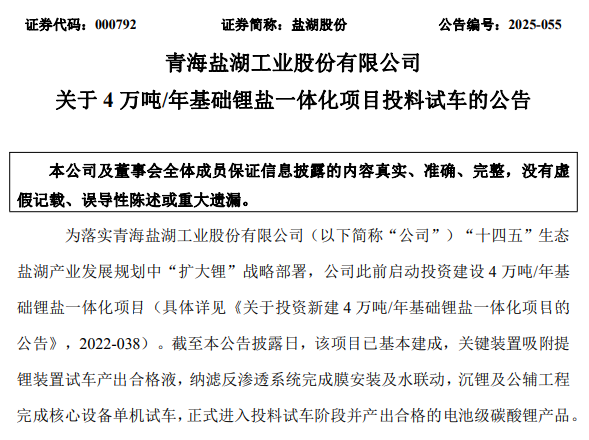 中国粉体网讯9?9日,盐湖股份发布公告称,公司此前启动投资建设4万吨/年基础锂盐一体化项目已基本建成,关键装置吸附提锂装置试车产出合格液,纳滤反渗透系统完成膜安装及水联动,沉锂及公辅工程完成核心设备单机试车,正式进入投料试车阶段并产出合格的电池级碳酸锂产品、br/>