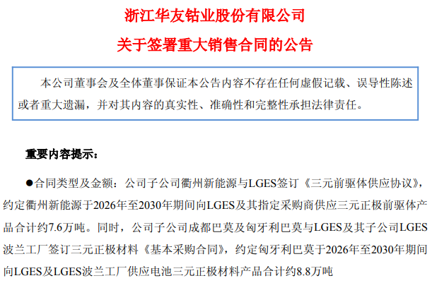 华友钴业表示,锂电新能源材料产业是公司重点发展的核心业务,也是公司产业一体化的龙头。本次与LGES及其子公司签订长期供货合同,有利于进一步深化双方战略合作关系,在提升公司锂电新能源材料市场占有率的同时,持续深化“上控资源、下拓市场、中提能力”的一体化发展优势,进一步增强公司在锂电新能源产业链中的核心竞争力。合?协议对当期不产生重大影响,待正式供货后,预计将对公司2026年至2030年的经营业绩产生积极影响、/p>
