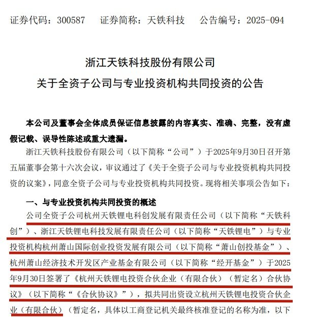 据公告消息,天铁科技全资子公司杭州天铁锂电科创发展有限责任公司(简称:天铁科创)、浙江天铁锂电科技发展有限责任公司(简称:天铁锂电)与专业投资机构杭州萧山国际创业投资发展有限公司(简称:萧山创投基金)、杭州萧山经济技术开发区产业基金有限公司(简称:经开基金)于2025??0日签署了《杭州天铁锂电投资合伙企业(有限合伙)(暂定名)合伙协议》,拟共同出资设立杭州天铁锂电投资合伙企业(有限合伙)(暂定名,具体以工商登记机关最终核准登记的名称为准,简称“合伙企业”)、/p>