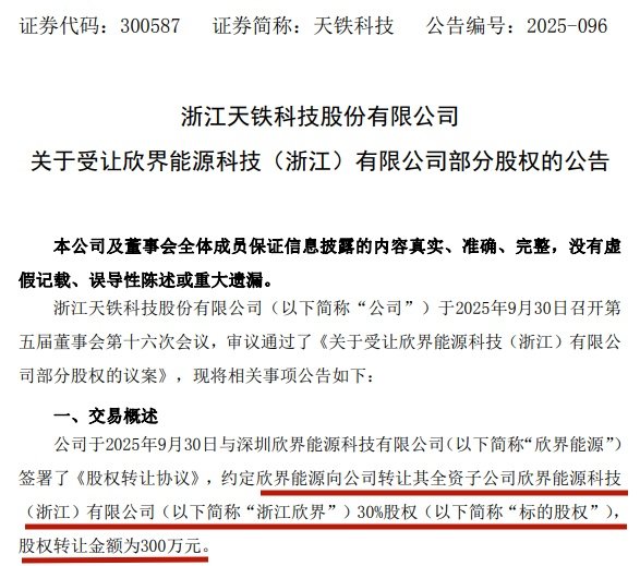据公告消息,2025??0日,天铁科技与欣界能源签署了《股权转让协议》,约定欣界能源向天铁科技转让其全资子公司浙江欣界30%股权,股权转让金额为300万元、/p>