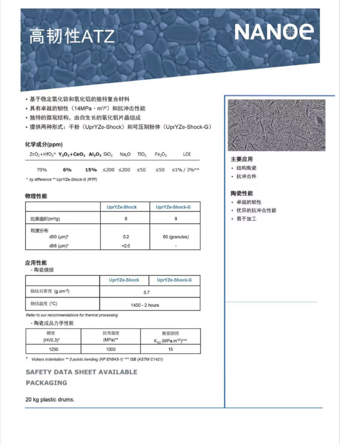 不想放弃氧化锆的高韧性优点,同时还要弥补其强度、硬度等方面的不足,法国NANOE公司选择采用氧化铝来增强氧化锆基体的方法+span style="color: rgb(192, 0, 0);">推出了适用于定位销的高韧性ATZ粉体、/span>