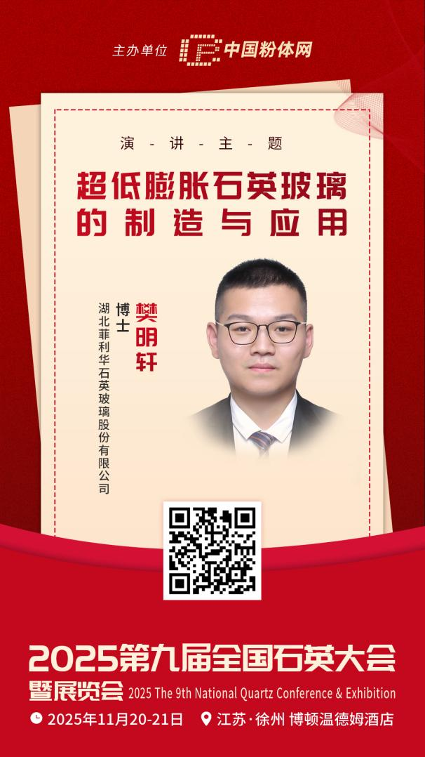 2025?1?0-21日,由中国粉体网主办的‛span style="color: rgb(192, 0, 0);">2025第九届全国石英大会暨展览伙/strong>”将?strong>江苏徐州召开+strong>湖北菲利华石英玻璃股份有限公号/strong>皃strong>樊明?/strong>博士将做〉strong>超低膨胀石英玻璃的制造与应用》的报告,届时,他将详细解读超低膨胀石英玻璃的制造与应用等关键问题,为行业同仁提供极具价值的参考与借鉴、/p>