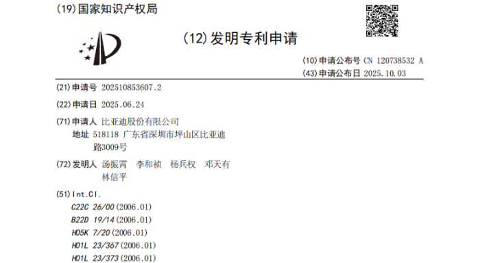 中国粉体网讯近日,国家知识产权局信息显示,比亚迪股份有限公司申请一项名为‛strong>金刚?金属复合材料及其制备方法、散热基板、功率模块、车辅/strong>”的专利,公开号CN120738532A。这项专利预示着比亚迪在电动汽车核心部件散热技术上的潜在突破,有望进一步提升电动汽车的性能表现、/p>