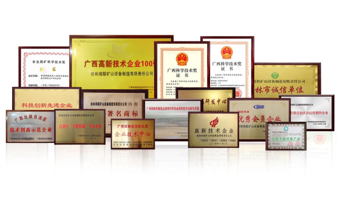 桂林鸿程先后荣获“高新技术企业“/span>?/span>“国家知识产权优势企业”、“广西工业龙头企业”、“广西制造业单项冠军示范企业”、“广西科技进步奖一等奖”等称号,荣获摆式磨粉机分级机、磨粉机开路收集系统、磨粉机布袋收集系统、环辊磨减震基础、雷蒙磨主机内分料结构、磨粉机远程智能监控系统等在冄/span>皃/span>专利证书、/span>