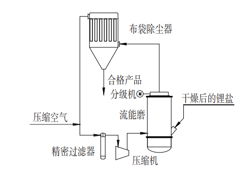 在新能源电池材料领域,经过结晶、干燥后的锂盐(碳酸锂或氢氧化锂产品)颗粒直径为50~80μm,目前行业内主要采用流能磨对干燥的电池级锂盐颗粒进行粉碎,以达到产品的粒径要求。结合电池级锂盐的生产特点,目前主要设备型式大多采用流化床式,通过在流化床流能磨的出口安装分级机,在流化床和分级机的协同作用下,保证锂盐产品的粒径和粒度分布满足用户要求、/p>