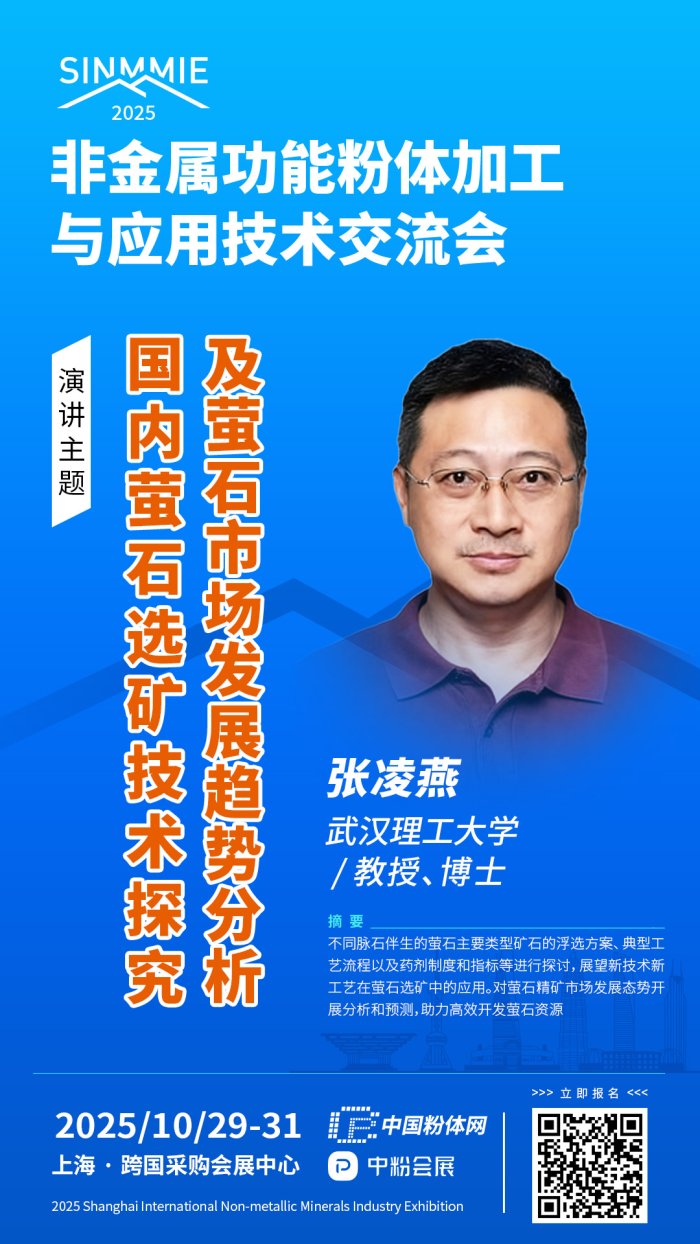 10?9-31?/span>+strong>北京粉体技术协会、柏德英思展觇/span>'/span>上海(/span>有限公司、山东中粉会展服务有限公号/span>将在上海跨国采购会展中心联合主办‛/span>上海国际非金属矿工业展览伙/span>'/span>SINMMIE2025)“/span>,展会现场将同期举办“非金属功能粉体加工与应用技术交流会“/span>,届时将邀诶strong>武汉理工大学张凌燕教掇/span>佛strong>《国内萤石选矿技术探究及萤石市场发展趋势分析《/span>主题报告,分析国内萤石资源现状和特征,对不同脉石伴生的萤石主要类型矿石的浮选方案、典型工艺流程以及药剂制度和指标等进行探讨,展望新技术新工艺在萤石选矿中的应用。同时对萤石精矿市场发展态势开展分析和预测,为萤石资源的高效开发提供基础性信息、/span>