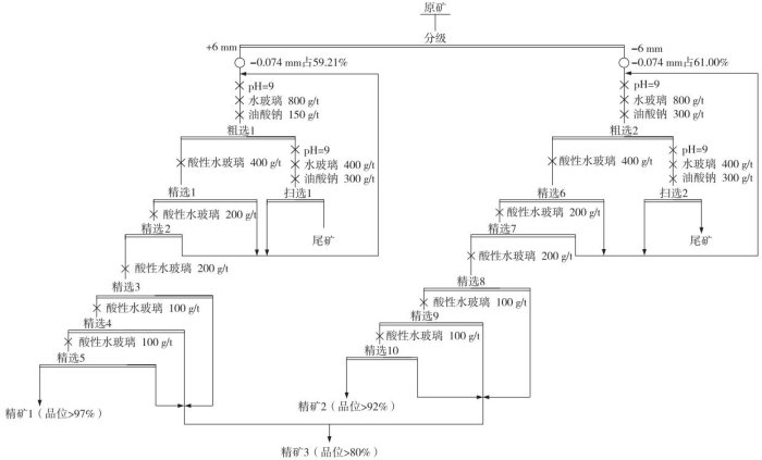 石英型萤石矿:常用一段粗磨粗选—粗精矿再磨—多次精选的工艺流程、/span>