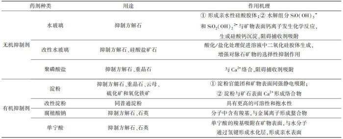 含钙矿物(萤石、方解石)表面具有相似的Ca2+离子活性位点、溶解性、表面电荷,与传统脂肪酸类捕收剂具有相近的反应活性。因此,需要选择性地抑制脉石矿物,使其表面更加亲水,增大脉石矿物与目的矿物颗粒之间的表面性质差异,最终实现分离。萤石浮选中的抑制剂大致可分为两类,即无机抑制剂和有机抑制剂、/span>