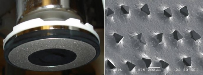 在CMP(化学机械抛光)工艺中,抛光垫本身不断被抛光而变得光滑,使用过的抛光液以及在抛光过程中产生的废弃物会沉积在抛光垫的表面,这就需要使用修整盘对抛光垫进行修整再生,重新塑造抛光垫的表面粗糙度,恢复使用性能。修整可以清除堵塞小孔的碎屑和微粒,去除抛光垫的釉面,使抛光垫得到重生,获得所需的粗糙度和多孔性。此外,修整还可以减少更换抛光垫的次数,节省使用新抛光垫所需的重新调整校正到稳定的步骤和时间,从而大大提高CMP工艺的稳定性、/p>