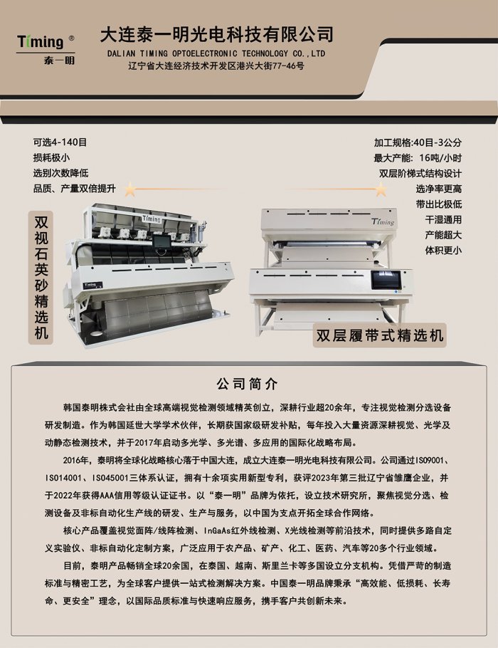 韩国泰明株式会社是由韩国色选机专业领域的一批精英所组建。它始终坚持以质量求生存,以信誉求发展,不断研发设计和生产新产品,始终走在世界色选机行业的前例。我公司的产品遍及世?0多个国家,并在泰国、越南、斯里兰卡、印度、秘鲁设立了分支机构。我公司的研发者具有二十年色选机研发制造经验,现已成功开拓大米、瓜子、杂粮、脱水蔬菜、茶叶等领域。并专门针对石英砂,盐等特殊物料研制出防腐色选机。该机器可选别20-100目区间颗粒的产品、/p>