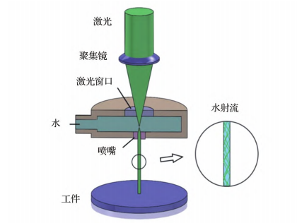 水导激光原理:由于水和空气的折射率不同,在激光束以一定角度照射在水与空气交界面时,如果入射角小于全反射临界角,激光会发生全反射而不会透射出去,这就使激光能量始终被限制在水束中从而使激光沿水束的方向进行传播。激光经过凸透镜聚焦后通过石英玻璃窗体进入到耦合水腔,通过调整聚焦透镜与小孔喷嘴之间的距离,使激光焦点刚好处于小孔喷嘴上表面中心,然后进入稳定的水射流中,利用水与空气折射率的不同,在水射流中发生全反射,类似于传统玻璃光纤的传播方式。加工时,聚焦到喷嘴位置的激光束由高压水束引导传输到工件表面、/p>