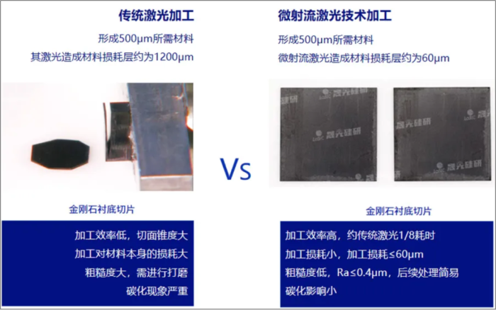 目前晟光硅研已成功研发出基于水导激光技术的单晶金刚石加工新工艺。该技术凭借其独特的加工机理,有效突破了传统激光加工在大尺寸金刚石材料领域的技术局限,可实现超大尺寸单晶金刚石切片,切割损耗小?0μm规格的金刚石材料的高效、高精度切片,填补了该尺寸段工业化精密加工的技术空白、/p>