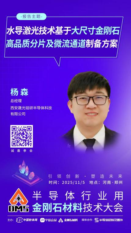 2025?1?日,中国粉体网将?strong>河南?郑州举办‛strong>2025半导体行业用金刚石材料技术大伙/span>”。届时,来自西安晟光硅研半导体科技有限公司总经理杨?/strong>将带来〉strong>水导激光技术基于大尺寸金刚石高品质分片及微流通道制备方案》的报告、/p>