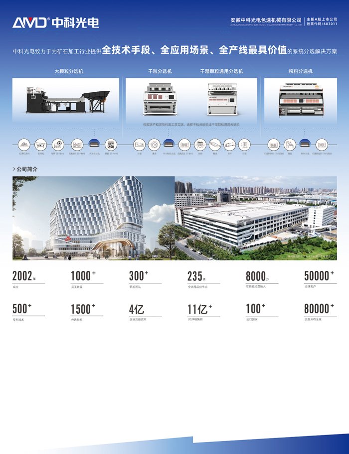 安徽中科光电色选机械有限公司坐落于中国合肥,占地面?5万平方米,总投?.5亿,员工人数760多人,科研楼25000平方米,是一家专业从事智能分选设备研发、生产、销售的高新技术企业。历经十多年的发展,已成为拥有员工超600人,销售收入?亿元的大型智能分选设备生产基地。 公司全面通过了质量管理体系认证、环境管理体系认证、职业健康管理体系认证,“安美达”系列产品通过了欧盟CE认证。严格的质量管理体系保障了公司产品和服务的质量,在全国乃至世界打响了“安美达”品牌。“色选,我们无处不在”是中科光电对于色选技术的追求和承诺。“安美达”牌系列智能色选机市场份额位列三甲,并成功远销一百多个国家和地区 公司成立专门研发中心并被认定授予“安徽省企业技术中心”和“博士后科研工作站”,且与合肥工业大学共建智慧辨识与分拣工程技术中心。先后获得自主知识产权近48项,高新技术产?项,并参与制?项安徽省地方标准。“安美达”品牌被认定为“中国驰名商标”、“安徽省著名商标”。公司先后被认定为“国家高新技术企业”、“安徽省知识产权优势企业”、“合肥市知识产权示范企业”、“合肥市两化融合示范企业”、“合肥市创新型企业”?nbsp;