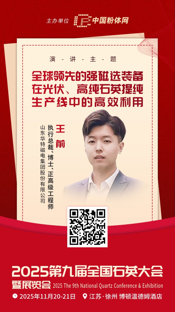 2025?1?0-21日,中国粉体罐/strong>将在江苏徐州举办?025(第九届)全国石英大会暨展览会”、/strong>届时+span style="color: rgb(192, 0, 0);">山东华特磁电集团股份有限公司执行总裁王前将带来题丹strong>《全球领先的强磁选装备在光伏、高纯石英提纯生产线中的高效利用《/span>的报告,分享强磁选装备在相关领域的应用实践与技术成果、/p>