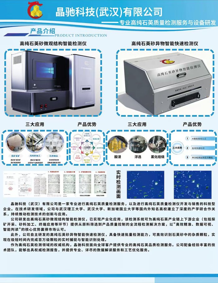 晶驰科技(武汉)有限公司是专注于高纯石英质量检测领域的科技型企业,集检测技术服务、智能化检测仪器研发与销售于一体。公司总部坐落于湖北省武汉市洪山区——这座被誉为"中国大学之城"的创新高地,依托区域丰富的高校人才资源和四通八达的交通网络,为企业发展注入强劲动能、/p>