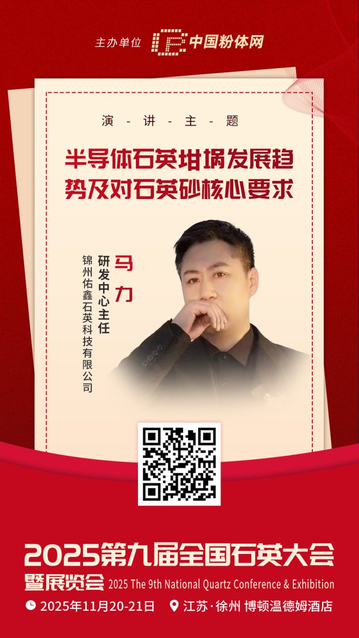 2025?1?0-21日,中国粉体罐/strong>将在江苏徐州举办?025(第九届)全国石英大会暨展览会”。届时,锦州佑鑫石英科技有限公司研发中心主任马力将带来题丹span style="color: rgb(192, 0, 0);">《半导体石英坩埚发展趋势及对石英砂核心要求《/strong>的报告,深入解读行业关键技术与发展方向、/p>