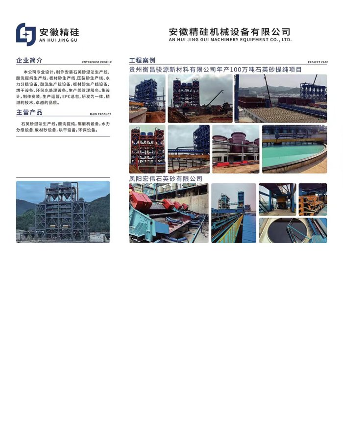 公司专业设计,制作安装石英砂湿法生产线、酸洗提纯生产线、板材砂生产?压裂砂生产线、水力分级设备、酸洗生产线设备,板材砂生产线设备、烘干设备、环保水处理设备、生产线管理服务。集设计,制作安装,生产运营,EPC总包,研发为一体,精湛的技术,卓越的品质、/p>