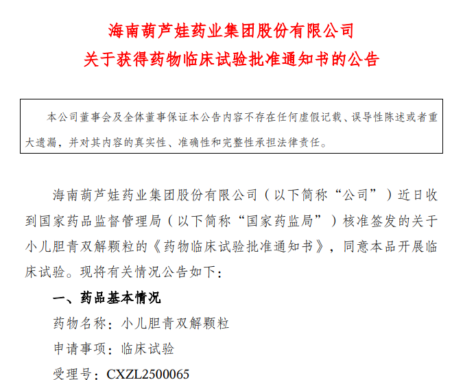 ä¸å›½ç²‰ä½“网讯10æœ?7日,ST葫芦娃å‘布公告,宣布公å¸è¿‘日已获得国家è¯å“监ç£ç®¡ç†å±€æ ¸å‡†ç¾å‘的关于ä¸è¯åˆ›æ–°è¯å°å„¿èƒ†é’åŒè§£é¢—粒的《è¯ç‰©ä¸´åºŠè¯•éªŒæ‰¹å‡†é€šçŸ¥ä¹¦ã€‹ï¼Œè¯¥é€šçŸ¥ä¹¦åŒæ„å°å„¿èƒ†é’åŒè§£é¢—粒开展临床试验ã€ü/p>