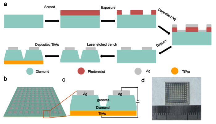 郑州大学单崇新教授团队基于单晶金刚石构建了一?0×10的X射线探测器阵列,系统评估了该探测器在成像与探测性能方面的可行性与潜力。器件采用了非对称“三明治”夹层电极结构,同时通过激光刻蚀技术在像素之间形成隔离沟槽,有效抑制了邻近像素间的电信号串扰。结果表明,该金刚石X射线探测器阵列展现出优异的性能指标,最低检测限?.9?nGy·s-1,灵敏度高达14.3?mC·Gy-1·cm-2,明暗电流比?8312,均为迄今为止金刚石X射线探测器中最具代表性的优异性能。此外,该器件能够在高达450℃的温度下稳定运行,展示出其在高温、强辐射等极端环境中广阔的应用前景、/p>