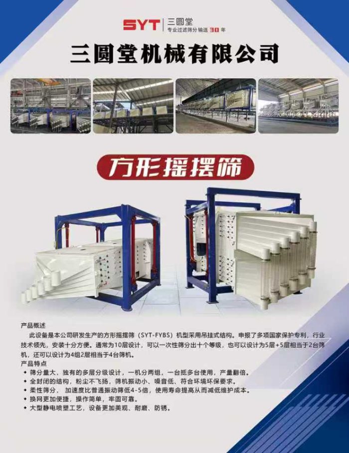 在科技研发方面,公司根据多年的生产经验以及专业的技术团队对公司的产品不断的优化升级。所生产的旋振筛、摇摆筛、方形摇摆筛、气流筛分机、超声波振动筛分机、振动直排筛等产品得到了国内外客户的使用认可及好评、/p>