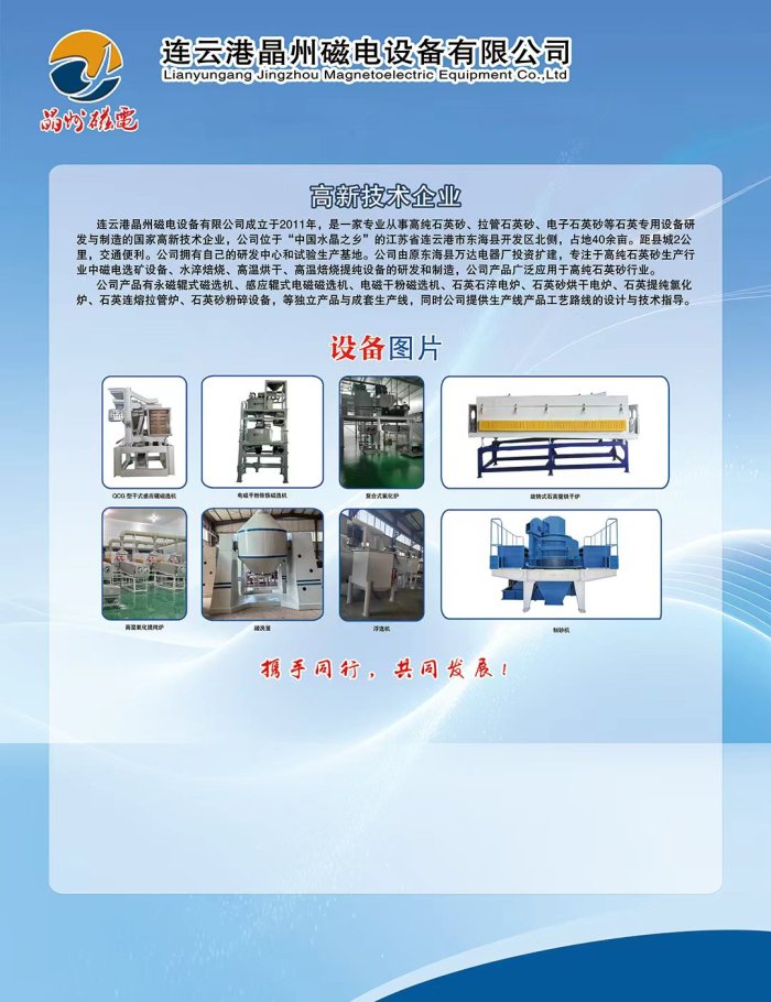 连云港晶州磁电设备有限公司成立于2011年,是一家专业从事高纯石英砂、拉管石英砂、电子石英砂等石英专用设备研发与制造的国家高新技术企业,公司位于“中国水晶之乡”的江苏省连云港市东海县开发区北侧,占?0余亩。公司拥有自己的研发中心和试验生产基地,专注于高纯石英砂生产行业中磁电选矿设备、水淬焙烧、高温烘干、高 焙烧氯化提纯设备的研发和制造,公司产品广泛 用于高纯石英砂行业。公司于2024年投产年生产5000万吨高纯超高纯石英砂生产线、/p>